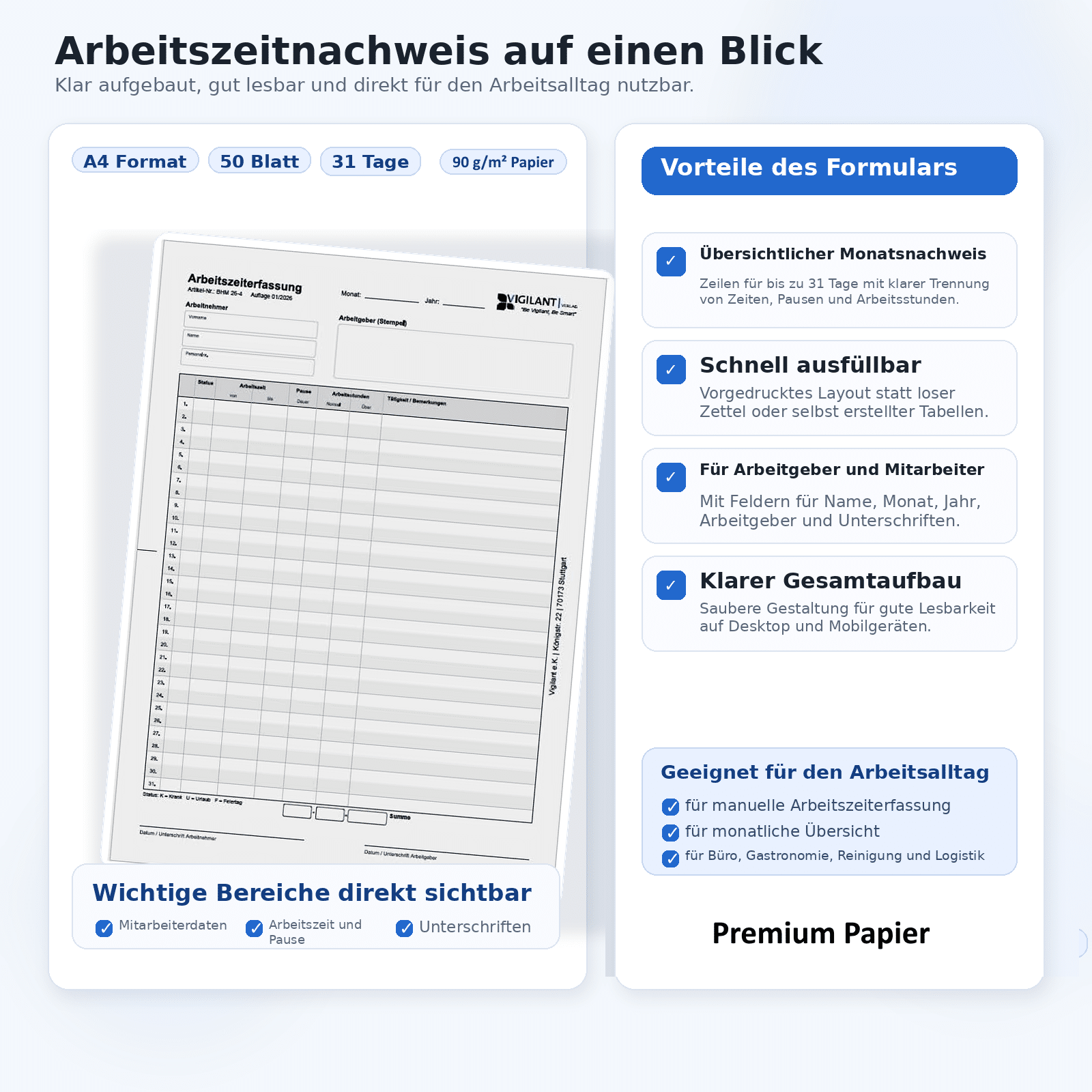 Ein Block reicht für über 4 Jahre – oder für Ihr gesamtes Team einen Monat. Die praktische Abreißperforation ermöglicht saubere Ablage in der Personalakte.